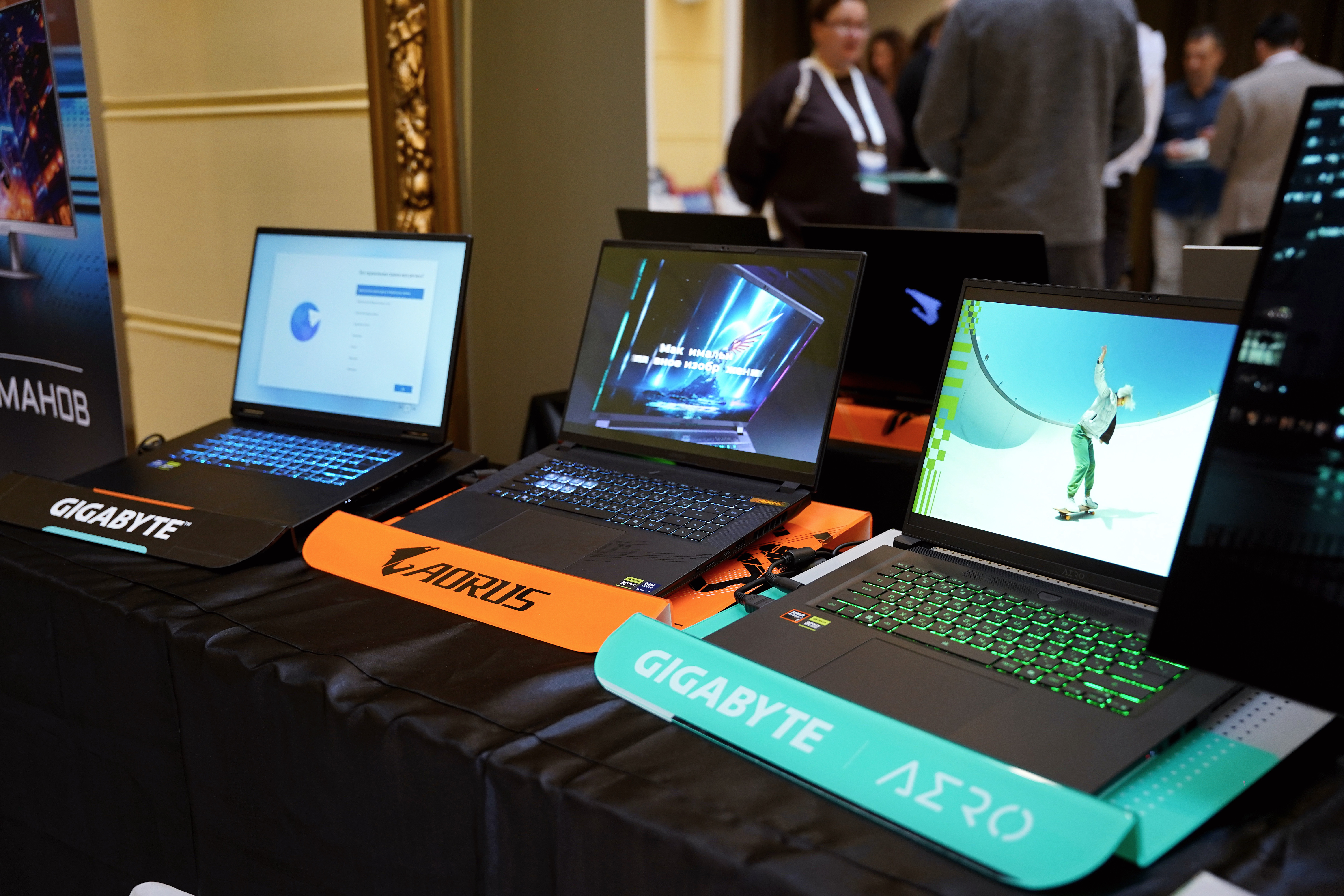 Стенд GIGABYTE был посвящён игровым мониторам AORUS/GIGABYTE и ноутбукам нового поколения на базе графики GeForce RTX 50-й серии. В части мониторов были представлены актуальные модели с высокими частотами обновления (200-500 Гц и выше), поддержкой QHD и UHD-разрешений, технологиями OLED и расширенным цветовым охватом, а также акцентом на эргономику, защиту зрения и трёхлетнюю гарантию, включая защиту от выгорания OLED-панелей. Линейка ноутбуков включала серии AORUS Master, AERO и Gaming A16/A18 с современными процессорами Intel и AMD, дискретной графикой RTX 50xx, высокочастотными дисплеями и фирменной платформой GiMATE на базе ИИ для интеллектуального управления производительностью, охлаждением, питанием и конфиденциальностью.